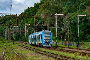 01.05.2011 | Osina - Wyszomierz | SA136-009 jako REGIO do Płot (modernizacja odcinka Płoty - Gryfice) przejeżdża pod ukrytym w lesie wiaduktem drogowym. |