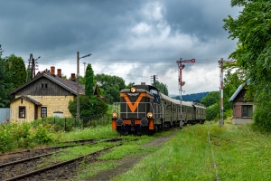 03.07.2016 | Mszana Dolna | SP42-260 z pociągiem turystycznym do Chabówki opuszcza stację w Mszanie Dolnej, mijając nieczynną głowicę stacyjną od strony Chabówki.