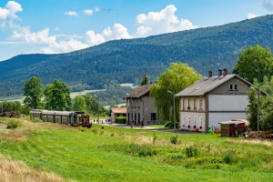 31.07.2016 | Tymbark | SP42-260 z turystycznym "Pociągiem Transwersalnym" (relacji Nowy Sącz - Chabówka) zatrzymuje się na chwilę na stacji w Tymbarku. Po lewej podupadający magazyn kolejowy.