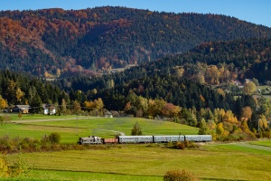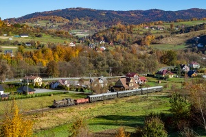 14.10.2018 | Pisarzowa | SM42-1006 z przesyłem próżnych wagonów (plan PWS 336026) z Nowego Sącza do Chabówki podąża szlakiem w kierunku Limanowej. Skład wjechał w obręb dawnej stacji w Pisarzowej (głowica od Męciny).